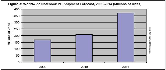在筆記本電腦的三大領(lǐng)域中,上網(wǎng)本2010年出貨量將達(dá)到3450萬臺(tái),比2009年增長(zhǎng)30%。到2014年,上網(wǎng)本出貨量預(yù)計(jì)將達(dá)5830萬臺(tái)。上網(wǎng)本是尺寸較小的筆記本,屏幕尺寸小于10.2英寸,價(jià)格低于500美元。