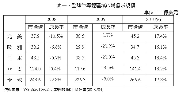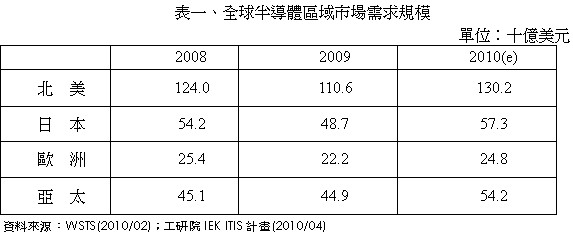 2009年全球半導(dǎo)體市場僅北美地區(qū)微幅成長1.7%,其他皆呈現(xiàn)負(fù)成長:亞太市場衰退3.5%,歐洲市場衰退21.9%,日本市場衰退21.0%。不景氣使得下游電子產(chǎn)品品牌大廠,如Dell、HP、Sony等廠商增加產(chǎn)品委外代工之比例,以降低生產(chǎn)成本,增加其產(chǎn)品競爭力。因此,2009年主要從事代工生產(chǎn)之亞太地區(qū),才會出現(xiàn)僅小幅衰退之情形。至于北美地區(qū)則是因?yàn)槭艿较掠纹放茝S商降價(jià)促銷成功,使得市場呈現(xiàn)小幅成長。