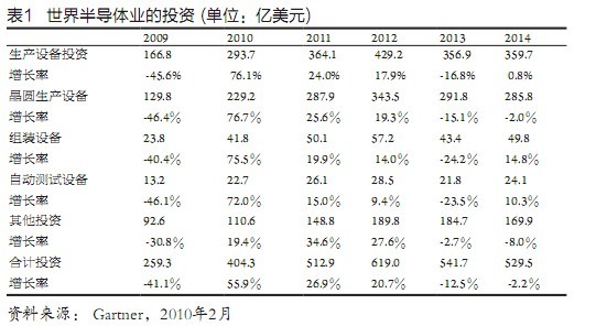近期半導(dǎo)體業(yè)的迅猛增長(zhǎng),推動(dòng)了半導(dǎo)體生產(chǎn)設(shè)備市場(chǎng)的快速?gòu)?fù)蘇,存儲(chǔ)器、代工業(yè)的發(fā)展以及進(jìn)一步走向微細(xì)化先進(jìn)技術(shù)的要求,則是主要的拉動(dòng)力量。在各項(xiàng)生產(chǎn)設(shè)備中晶圓生產(chǎn)線(wafer fab)設(shè)備最為重要,增長(zhǎng)也最快,2010年將竄升76.7%,達(dá)229億美元,獨(dú)占半導(dǎo)體生產(chǎn)設(shè)備的78%,整個(gè)半導(dǎo)體業(yè)投資的近57%。組裝設(shè)備增長(zhǎng)75.5%,達(dá)41.8億美元,自動(dòng)測(cè)試設(shè)備增長(zhǎng)72%,達(dá)22.7億美元。其他有關(guān)投資增長(zhǎng)19.4%,達(dá)110.6億美元,整個(gè)半導(dǎo)體業(yè)投資共增長(zhǎng)55.9%,達(dá)到404.3億美元(表l)。