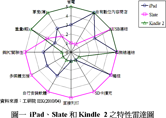 工研院IEK進(jìn)行iPad、Slate和Kindle 2三種產(chǎn)品有關(guān)省電、自有數(shù)位內(nèi)容商店、USB連結(jié)、無(wú)線連結(jié)、觸控、SD卡擴(kuò)充、直接列印、自行安裝軟體、多媒體支援、與PC關(guān)聯(lián)性、重量(輕)和厚度(薄)等特性的競(jìng)比,1分代表不具有其特性,為最低比重,分?jǐn)?shù)越高代表與此特性關(guān)聯(lián)性越強(qiáng),完全相關(guān)聯(lián)為最高5分,將其結(jié)果繪制成雷達(dá)圖(圖一)表示。