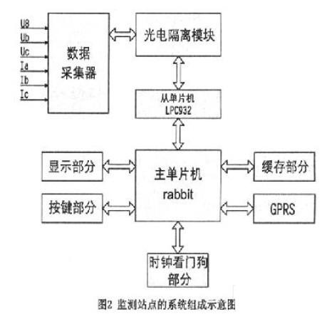 監(jiān)測(cè)站點(diǎn)由前端數(shù)據(jù)采集器和現(xiàn)場(chǎng)下位機(jī)構(gòu)成,其中前端數(shù)據(jù)采集器采用CS5460模塊和LPC932單片機(jī)構(gòu)成,它負(fù)責(zé)采集監(jiān)控現(xiàn)場(chǎng)的各項(xiàng)數(shù)據(jù)并存儲(chǔ)。線路的內(nèi)部經(jīng)過(guò)嚴(yán)格的電磁隔離,測(cè)量電路經(jīng)過(guò)采樣、A/D轉(zhuǎn)換處理后形成的數(shù)字信號(hào)再經(jīng)過(guò)光電耦合由信號(hào)適配器向從單片機(jī)LPC932傳送,主單片機(jī)與從單片機(jī)之間可采用I/O口模擬時(shí)序的方式進(jìn)行串口通信。