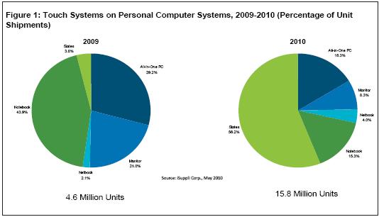 最近幾年,個人電腦市場對于觸摸屏的需求不斷增長,2008和2009年增長率超過20%,快于總體系統(tǒng)市場。但與該市場2010年462%的增長率相比,上述增長速度就相形見絀了。平板觸摸電腦是PC觸摸革命中的主要初期推動者,預(yù)計占PC觸摸市場的比例將從2009年的3.8%銳升到56.2%,而總體PC觸摸市場規(guī)模將擴大兩倍。