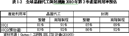 在IC制造業(yè)部分,預(yù)估2010Q2漸步入季節(jié)性需求上升期,配合產(chǎn)能逐步開出,臺灣IC制造業(yè)可望呈現(xiàn)價量齊揚的階段,帶動臺灣IC制造業(yè)產(chǎn)值上揚,預(yù)估可較2010Q1成長6.6%,并較去年同期成長47.6%