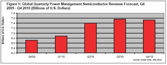 2010年第一季度,電源管理半導(dǎo)體銷(xiāo)售收入達(dá)到69億美元,比2009年第四季度的67億美元增長(zhǎng)2.9%。該市場(chǎng)在2009年第三季度曾陷入停滯,第四季度開(kāi)始擴(kuò)張,第一季度數(shù)據(jù)顯示該市場(chǎng)仍在擴(kuò)張。