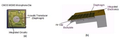 在CMOSMEMS平臺上開發(fā)的單塊集成電路硅晶麥克風解決方案使消費電子設(shè)備設(shè)計人員和制造商得以避免眾多ECM相關(guān)問題。下圖是一個單芯片硅晶麥克風的俯視圖和橫截面圖。這一單塊芯片由MEM換能器(transducer)和阻抗匹配線路組成,它也是一個帶有可移動振膜和剛性背板的電容性傳感器。