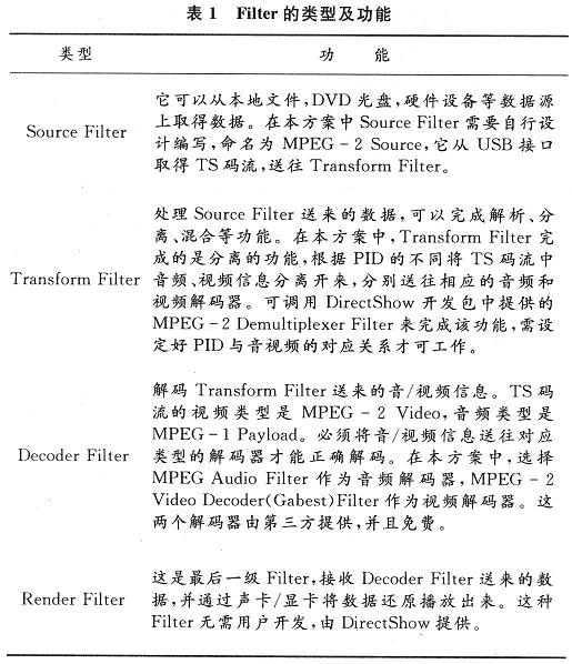軟件方面,PC機端應(yīng)用程序的核心部分是實時播放器,需要播放的是TS碼流,這是MPEG-2標(biāo)準(zhǔn)定義的一種碼流。本方案采用基于DirectShow技術(shù)搭建的媒體播放器。DirectShow是DirectX家族中的成員,它為在Windows平臺上處理各種格式的多媒體文件的回放、音視頻采集等高性能要求的多媒體應(yīng)用提供了完整的解決方案,重要的是它很好地支持了MPEG-2標(biāo)準(zhǔn),它使應(yīng)用程序開發(fā)人員從復(fù)雜的數(shù)據(jù)傳輸、硬件差異、同步性等工作解脫出來,總體應(yīng)用框架和底層工作由DirectShow來完成,大大加快了開發(fā)進(jìn)度。