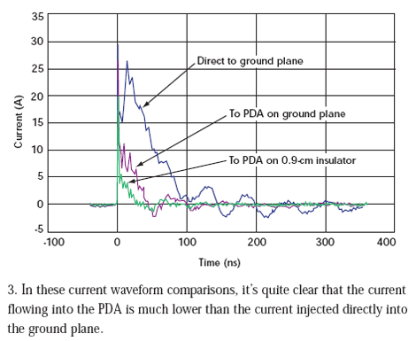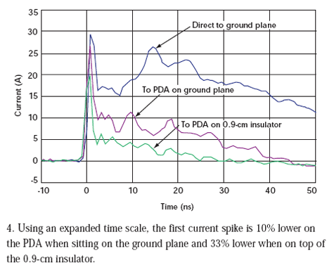 但是,我們見(jiàn)到的電流減小前后并不一致。當(dāng)PDA直接放在接地板上時(shí),初始電流尖峰降低了10%。當(dāng)PDA放在0.9cm絕緣層上時(shí),初始電流尖峰減低33%(圖4)。在20ns點(diǎn),直接放在接地板上的PDA受到的沖擊要小69%,而位于絕緣層上的PDA受到的沖擊要小93%。電流減少是在沖擊狀態(tài)下給PDA充電的結(jié)果。在每次沖擊測(cè)試過(guò)程結(jié)束后,我們必須將PDA接地使它回到未充電狀態(tài)才能進(jìn)行下次測(cè)量。