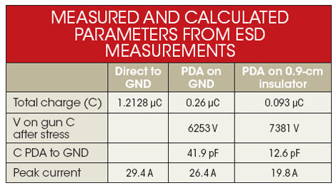 對(duì)充電到PDA的電流進(jìn)行積分,可以得到從ESDqiang轉(zhuǎn)移到PDA的電荷數(shù)量。從ESDqiang轉(zhuǎn)移到PDA的電荷量可以用來(lái)計(jì)算ESDqiang的150pF電容上剩下的電壓,然后再算出PDA上的電壓。理解這個(gè)電壓以及PDA上測(cè)到的電荷之后,就可以計(jì)算出PDA和接地板之間的電容(見(jiàn)表1)。