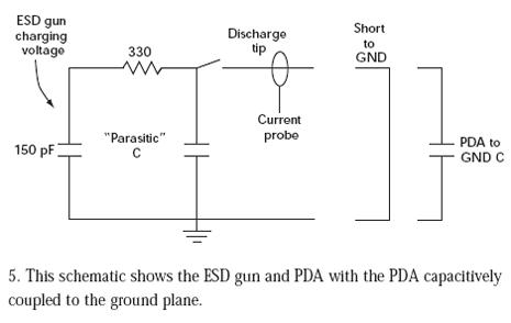 向PDA的放電通過(guò)一個(gè)并行平板電容表示,其中一個(gè)極板是PDA的一部分,另一個(gè)極板是接地板。在脈沖初期,PDA電容提供較低的阻抗,注入進(jìn)PDA的電流近似于到地的放電電流。繼續(xù)施加脈沖,電荷在PDA到接地板電容中累積,因此PDA上的電位上升,直到PDA和接地板之間的電位和150pF電容上的電壓相等。這時(shí),不再有電流流動(dòng),即使ESDqiang的電容還沒(méi)有完全放電。