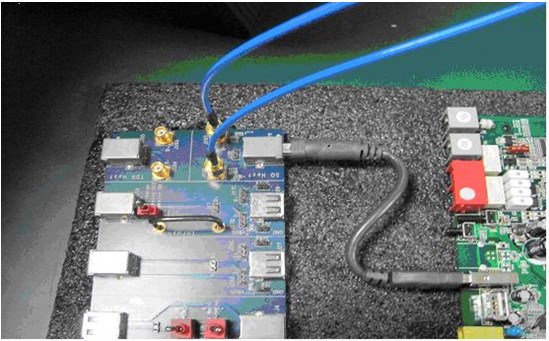 在和客戶方面的資深工程師分析和討論之后,我們有了一個非常巧妙的解決方案,當然還需要實際的測試來驗證。USB專業(yè)測試人員都知道,USB IF針對USB一致性測試提供了一個專用測試工具 (USB-IF HS Electrical Test Tool)以方便開發(fā)者進行相關(guān)的USB測試。但這個工具只能運行在PC主機上,而我們的嵌入式系統(tǒng)其實也是通過相應(yīng)的底層命令來實現(xiàn)這個工具相關(guān)的測試功能。從測試拓撲來看,我們目前的問題主要在于嵌入式控制主機無法實現(xiàn)對USB Hub的控制和測試模式設(shè)定。從控制系統(tǒng)的角度來說,不管是嵌入式控制主機還是PC主機都實現(xiàn)的是USB主機控制器的作用,也就是說我們可以使用PC主機替代嵌入式控制主機,在一臺裝有USB-IF HS Electrical Test Tool的PC上對產(chǎn)品板級USB Hub進行Down Stream Facing Port的Test Packet測試了。當然,我們首先要斷開嵌入式控制主機與USB Hub之間的Up Stream Facing Port并飛線與PC主機的USB接口連接。因為測試單扳本身提供5V供電,所以我們只需要飛出D+/D-/GND三線即可。完成后的圖示如下: