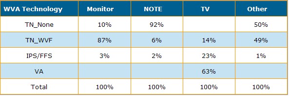 在 Quarterly Wide Viewing Angle Technology Report, (DisplaySearch季度廣視角技術(shù)出貨報告) 中,DisplaySearch 追蹤了各面板廠商在不同視角技術(shù)面板的出貨應(yīng)用與出貨尺寸。LG Display是TN型出貨的全球領(lǐng)先,2010年第一季TN面積市占率達到29%,三星以及新奇美(Chimei Innolux)則在TN-WVF (TN加廣視角膜)的市占率并駕齊驅(qū),都達到22%。另外以IPS/FFS而言,LG Display以88%的面積市占率領(lǐng)先,VA出貨則由三星以39%的面積市占率領(lǐng)先。