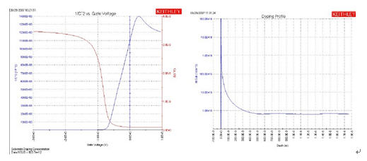 圖5.利用吉時(shí)利4200-SCS進(jìn)行參數(shù)提取的實(shí)例表現(xiàn)了半導(dǎo)體的摻雜特征(左邊的藍(lán)線),它與1/C2與Vg的關(guān)系呈倒數(shù)關(guān)系(紅線)。右圖給出了摻雜分布,即每立方厘米的載流子數(shù)與襯底深度的函數(shù)關(guān)系。