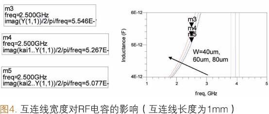 [page]除互連線長度之外,互連線的寬度也會對RF電容產(chǎn)生影響。在襯底的制作過程中,線寬通常會發(fā)生變化(舉例來說,與設(shè)計(jì)寬度相比,實(shí)際線寬的變化范圍為±10.0μm~±15.0μm)。如圖4所示,如果設(shè)計(jì)的互連線為1.0mm長,60.0μm寬,實(shí)際卻達(dá)到40.0μm寬,在2.5GHz下等效電容變化將達(dá)到5.3%(以3.0pF接地SMD電容為例)。如果把這種SMD電容用于濾波器中,對于RF應(yīng)用來說,電容值5.3%的變化將導(dǎo)致約2.7%的頻移。我們必須對RF應(yīng)用中含有SMD電容的RFSiP模塊的襯底制造容差進(jìn)行細(xì)致研究。