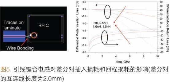 圖5顯示了鍵合引線電感是如何影響差分對連線的插入損耗的。在實(shí)例中,100.0Ω差分對的長度為2.0mm。假設(shè)差分對的一端使用引線鍵合方式與RFIC連接,并把直接與引線長度相關(guān)的電感(L)設(shè)為可變值。正像回程損耗曲線圖表示的那樣,加上引線鍵合電感可使差分對偏離100.0Ω這一匹配條件,結(jié)果使插入損耗增大。在5.0GHz下,0.5nH、1.0nH和1.5nH引線電感的插入損耗分別為0.2dB、0.5dB和1.2dB。即使達(dá)到極高的頻率,疊層上的差分對本身仍具有良好的阻抗匹配特性。