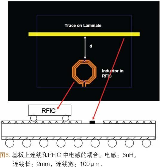 為了對主時(shí)鐘線和RF元件之間的相互作用進(jìn)行分析,把壓控振蕩器(VCO)中使用的RF電感(6.0nH)放置在穿通多層襯底的時(shí)鐘互連線附近(圖6)。我們在這個(gè)研究中使用的互連線長為2.0mm。當(dāng)VCO電感和互連線之間的橫向距離(d)大于0.5mm時(shí),產(chǎn)生的耦合信號將小于-80.0dB。耦合信號的實(shí)際要求由SiP系統(tǒng)級電設(shè)計(jì)決定。