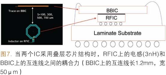 圖7給出了BBIC和RFIC采用SiP(為簡單起見,實(shí)例中未表示SMD元件)疊層芯片結(jié)構(gòu)的實(shí)例。在這個(gè)實(shí)例中未使用金屬屏蔽層,使用環(huán)氧芯片粘接材料把BBIC直接堆疊在RFIC上。就像前文提到的那樣,BBIC中的主時(shí)鐘信號(20.0MHz或40.0MHz)包含一些高頻成分,落在RF芯片通帶的范圍內(nèi)。如果BBIC中時(shí)鐘互連線和RF芯片之間沒有保持足夠的隔離,特別是在VCO電感中,主時(shí)鐘信號可能使RF電路產(chǎn)生噪聲,降低RF芯片的選擇性。