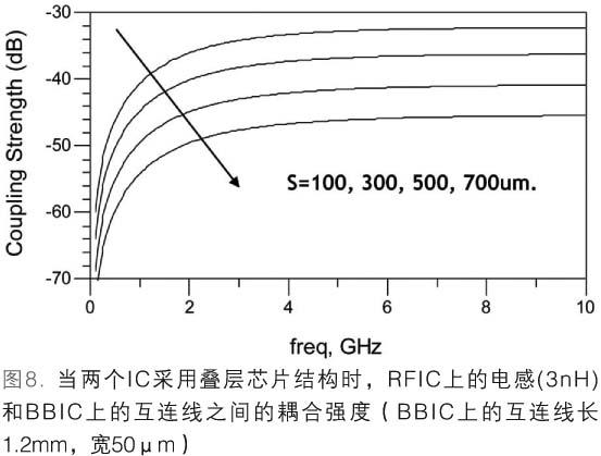 圖8表示了BBIC和RFIC電感之間的耦合強(qiáng)度(未使用隔離層)。假設(shè)BBIC和RFIC的厚度為250.0μm時(shí),對VCO電路中的3nH電感進(jìn)行了研究。BBIC中主時(shí)鐘的互連線設(shè)置為1.2mm長。根據(jù)模擬結(jié)果,當(dāng)橫向距離(S)為100.0μm時(shí),2.5GHz下的隔離為-35dB。這一隔離值對大多數(shù)RF應(yīng)用來說是不夠的。當(dāng)橫向距離為700.0μm時(shí),隔離值提高為-50dB,這個(gè)值對大多數(shù)RF應(yīng)用來說仍然不夠。為保證VCO電感的性能,位于BBIC電感上方的主時(shí)鐘不能使用長互連線。根據(jù)以上分析,我們還應(yīng)對RFSiP使用的疊層芯片法做進(jìn)一步研究,從而判斷BBIC和RFIC器件之間出現(xiàn)嚴(yán)重相互干擾的可能性。