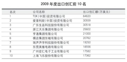 對于中國電子元件行業(yè)的外貿(mào)出口來說,2009年是一個從谷底緩慢爬升的過程。本屆元件百強中出口創(chuàng)匯總額為52.48億美元,同比下降10.38%,占銷售收入總額的28.81%,與上屆元件百強的出口總額相比,下降了9.83%。由于國際金融危機導(dǎo)致了外需萎縮,而且我國刺激內(nèi)需的各項政策效果明顯,一些元件百強企業(yè)開始更多地關(guān)注國內(nèi)市場,所以本屆元件百強的出口創(chuàng)匯額雖然下滑,但整體銷售收入仍然獲得增長。