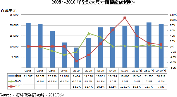 拓墣產業(yè)研究所調查顯示,2010下半年面板產業(yè)需求、供給皆持續(xù)成長,其中以LGD成長幅度最高,主因于8.5代線第二階段設備開始量產,逐季增加產能,而臺灣業(yè)者以新奇美增加6代線與8.5代線產能、中國則是京東方量產6代線,其余廠商多將既有設備提升產能,預期第三季產能面積增加6.3%,第四季持續(xù)增加5.7%。