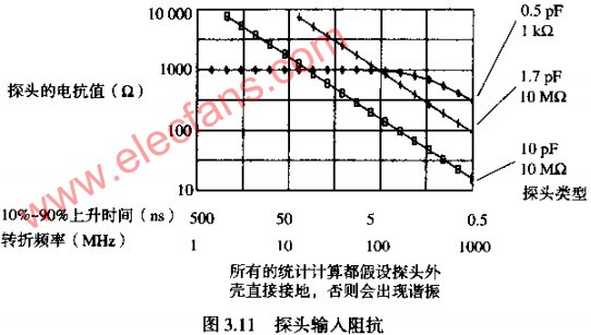 參見圖3.11,在我們關(guān)注的上升時(shí)間范圍內(nèi),探頭的并聯(lián)電容越高,阻抗會(huì)越低。在高頻時(shí),只有并聯(lián)電容比較重要。