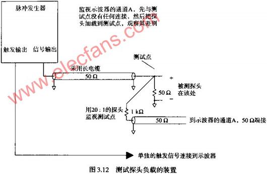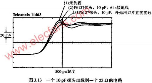 圖3.13展示了一個(gè)TEKTRONIXP6137探頭連接到測(cè)試點(diǎn)時(shí)的情形。P6137是一個(gè)10倍衰減,10PF的100MΩ類型探頭,應(yīng)探頭連接到400MHZ的便攜式示波器。第一個(gè)波形是沒有加載探頭時(shí)的記錄結(jié)果;第二個(gè)波形是加載了帶有6IN長(zhǎng)接地線探頭時(shí)記錄的結(jié)果;第三個(gè)波形是將裸探頭的尖端觸點(diǎn)直接接觸測(cè)試點(diǎn)A,探頭外殼用刀片直接接地時(shí)得到的結(jié)果。