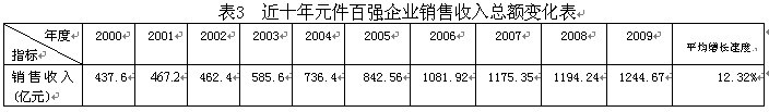 從本屆元件百?gòu)?qiáng)的整體銷售收入來(lái)看,第23屆元件百?gòu)?qiáng)企業(yè)2009年度銷售總額為1244.67億元,同比增長(zhǎng)2.36%,同比增長(zhǎng)率僅比去年(1.61%)略高,元件百?gòu)?qiáng)總體銷售收入增幅已連續(xù)三年低于10%。與第22屆元件百?gòu)?qiáng)的銷售總額相比,本屆元件百?gòu)?qiáng)的銷售總額增加了4.22%,近10年來(lái),中國(guó)電子元件百?gòu)?qiáng)的銷售收入總額增長(zhǎng)2.84倍,年平均增長(zhǎng)率為12.32%(見(jiàn)表3,圖一)。