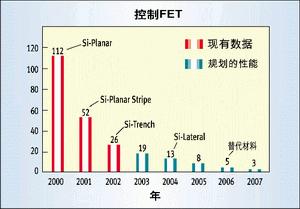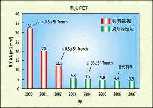 圖2所示的是同步或稱低端(low-side)FET的品質(zhì)因數(shù)。在這里,實(shí)際上是傳導(dǎo)損耗主宰了處在導(dǎo)通電阻時(shí)域的品質(zhì)因數(shù)。僅在過去的兩年中,通過將1至2微米溝道技術(shù)升級為深亞微米水平,就使品質(zhì)因數(shù)提高了約3倍,今后還有更多的改進(jìn)余地。