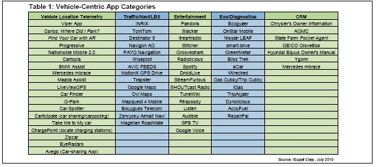 表1為iSuppli公司認(rèn)定的一些以汽車為中心的智能手機(jī)應(yīng)用程序。