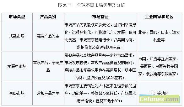 醫(yī)療設(shè)備的發(fā)展與國家和地區(qū)的經(jīng)濟(jì)發(fā)展水平、醫(yī)療政策以及當(dāng)?shù)鼐用袷杖胨较⑾⑾嚓P(guān),這些因素導(dǎo)致全球醫(yī)療監(jiān)護(hù)儀市場發(fā)展不平。根據(jù)市場特征以及對(duì)產(chǎn)品需求的不同可以將醫(yī)療監(jiān)護(hù)儀市場分為成熟市場、發(fā)展中市場和初級(jí)市場。