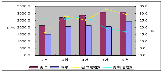 五、內(nèi)外銷保持同步增長(zhǎng),出口繼續(xù)快于內(nèi)銷。今年以來(lái),隨著外需不斷回暖,外銷出現(xiàn)持續(xù)增長(zhǎng),到5月底,全行業(yè)累計(jì)外銷增速開(kāi)始超過(guò)內(nèi)銷,進(jìn)入6月份,外銷增速優(yōu)勢(shì)進(jìn)一步加強(qiáng),超過(guò)內(nèi)銷增速4個(gè)百分點(diǎn)。其中,內(nèi)銷產(chǎn)值11975.5億元,同比增長(zhǎng)27.2%;出口交貨值16647.1億元,同比增長(zhǎng)31.2%,高于產(chǎn)業(yè)平均增速1.7個(gè)百分點(diǎn)。產(chǎn)業(yè)出口依存度(58.1%)比去年同期提高0.7個(gè)百分點(diǎn),比前5個(gè)月下降0.6個(gè)百分點(diǎn)。