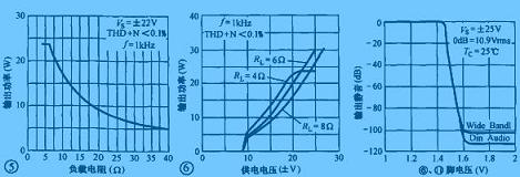 LM1876的負(fù)載范圍很寬,在4~30Ω的范圍內(nèi)均能穩(wěn)定地工作,其輸出功率與負(fù)載的對應(yīng)關(guān)系如圖5所示。LM1876的供電電壓范圍為±10~±25V,當(dāng)供電電壓降低時,影響的只是輸出功率的大小,而對其他指標(biāo)影響不大,供電電壓與輸出功率的對應(yīng)關(guān)系如圖6所示。LM1876的6、11腳為左/右聲道靜噪控制端,當(dāng)這幾腳接高電平(高于1.6V)時,LM1876內(nèi)部電路執(zhí)行靜音操作,切斷輸出端的音頻信號(如圖7所示)。因此可以在這些引腳中與正電壓之間接一個RC延時網(wǎng)絡(luò),使其在開機瞬間為高電平,輸出電路無音頻信號輸出,延時一段時間后,再正常輸出,以達(dá)到避免開機瞬間輸出端電位失諧對揚聲器的沖擊。在圖4中,晶體管VT1、R24、C16、R20、C15即為開機延時網(wǎng)絡(luò),調(diào)整它們的取值范圍,可以改變延時時間的長短,從而獲得滿意的開機延時時間。