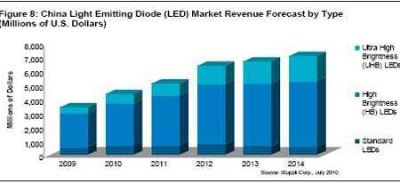另外,憑借政府的支持和LED日益進(jìn)入液晶電視及普通照明等新的應(yīng)用領(lǐng)域,iSuppli公司預(yù)測,2014年中國LED營業(yè)收入將達(dá)到71億美元,而2009年是34億美元,其間的復(fù)合年度增長率為12.8%。超高亮度(UHB)LED的增長速度更快,到2014年銷售額將從2010年的6.86億美元上升到18億美元,復(fù)合年度增長率為26.9%。