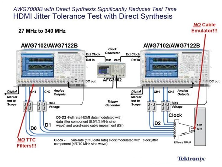 圖2:泰克獨一無二的AWG7000B直接合成方案可替換和省去所有類型的線纜仿真器和多達40個TTC濾波器,大幅降低HDMI接收端抖動容限測試的復雜度,并有效降低成本。
