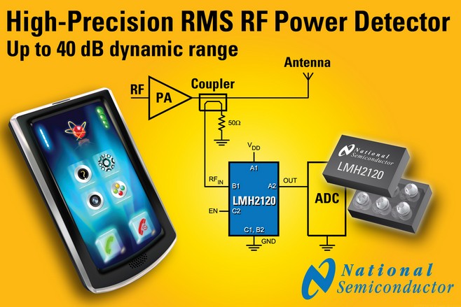 美國國家半導體的LMH2120線性均方根射頻檢波器可以準確測量射頻功率放大器(PA)的輸出,以便控制發(fā)射功率,避免干擾鄰近信號。LMH2120芯片可在攝氏-40度至85 度的全溫度范圍內(nèi)穩(wěn)定操作,在1900MHz輸入頻率下,在高達40dB 的寬動態(tài)范圍內(nèi),無論溫度如何變化,該芯片均可保持+/-0.5dB 的準確度,這令保護頻帶的范圍可以盡量縮小。該特性可擴大信號的覆蓋范圍并提高服務水平,如能在離蜂窩基站更遠的地方實現(xiàn)更高的上行鏈路數(shù)據(jù)速率。