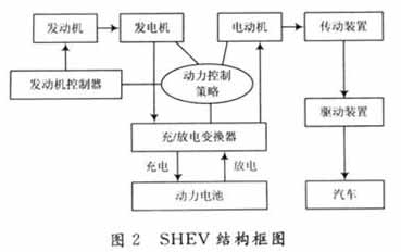 混合動力電動汽車由發(fā)動機(jī)和蓄電池共同提供動力,發(fā)動機(jī)和電動機(jī)可進(jìn)行不同組合得到不同的驅(qū)動方案,如:串聯(lián)、并聯(lián)及混聯(lián)。整車性能的好壞不僅與發(fā)動機(jī)和電動機(jī)等部件有關(guān),還與其控制策略和優(yōu)化方法有關(guān)。按照能源組合的方式,混合動力電動汽車可按動力驅(qū)動方式分為串聯(lián)式混合動力電動汽車(SHEV)和并聯(lián)式混合動力電動汽車(PHEV)。