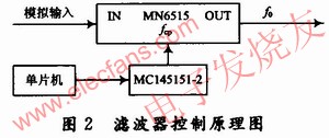 模擬器件的發(fā)展與集成為小型化提供了充分的條件,像松下公司的MN6515,僅為8腳,其帶通濾波器的中心頻率f0可由外加的時鐘頻率fcp控制,其比值fcp/f0約為15.7。只要改變fcp的值,帶通濾波器的中心頻率就會在O~32kHz范圍內移動,非常方便,可采用圖2方式進行控制。