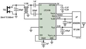 迄今為止,高集成度DC/DC升壓型轉(zhuǎn)換器一直比較缺少,這類轉(zhuǎn)換器可以收集和管理由極低的輸入電壓源提供的多余能量。不過,LTC3108極大地簡化了收集和管理由極低輸入電壓源提供的多余能量的任務(wù)。其升壓型拓?fù)湓谳斎腚妷旱椭?0mV時(shí)仍能正常運(yùn)行。這具有重大意義,因?yàn)樗试SLTC3108從低至1℃的溫度變化中收集TEG提供的能量。