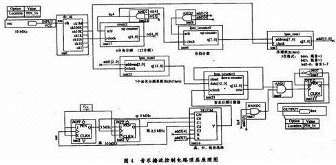 根據(jù)設計電路原理框圖,曲譜碼以分頻數(shù)編碼,音高信號分頻由一個可預置的模N計數(shù)器實現(xiàn)。分頻系數(shù)表和曲譜表都存儲在ROM中。若希望控制蜂鳴器的信號占空比為50%,分頻器的輸出信號采用二分頻電路實現(xiàn)占空比整形,但注意信號頻率被降低一半。電路原理框圖中M分頻器的作用是產(chǎn)生合適的時值計數(shù)脈沖頻率。電路的頂層原理圖如圖4所示。