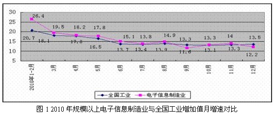 2010年是“十一五”規(guī)劃收官之年,也是我國(guó)電子信息產(chǎn)業(yè)回升調(diào)整的重要一年,受擴(kuò)內(nèi)需政策成效顯現(xiàn)和外需市場(chǎng)逐步回暖的共同作用,行業(yè)出現(xiàn)恢復(fù)性增長(zhǎng),總體呈現(xiàn)前高后穩(wěn)態(tài)勢(shì)。軟件產(chǎn)業(yè)和對(duì)外貿(mào)易出現(xiàn)新突破,經(jīng)濟(jì)效益穩(wěn)步提高,投資持續(xù)高位增長(zhǎng),產(chǎn)品結(jié)構(gòu)調(diào)整深入,產(chǎn)業(yè)鏈向上延伸的趨勢(shì)更加明 顯,企業(yè)、市場(chǎng)和區(qū)位布局出現(xiàn)新趨向,行業(yè)為推動(dòng)信息化發(fā)展和促進(jìn)兩化融合發(fā)揮積極作用,在國(guó)民經(jīng)濟(jì)發(fā)展和全球產(chǎn)業(yè)布局中日益占據(jù)重要地位。
