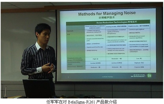 生活在都市的人們通常會(huì)在嘈雜的環(huán)境中撥打或接聽電話,人們總是希望能夠像在田野中一般獲得清晰并且沒有失真的聲音。對(duì)于手機(jī)廠商來(lái)講,采用能夠清晰拾取 語(yǔ)音并抑制噪聲的解決方案是關(guān)鍵。為了應(yīng)對(duì)上述挑戰(zhàn),安森美半導(dǎo)體推出了高性能語(yǔ)音捕獲SoC方案BelaSigna-R261。安森美半導(dǎo)體音頻與助聽 器中國(guó)市場(chǎng)開發(fā)經(jīng)理任軍軍在日前的產(chǎn)品發(fā)布會(huì)上對(duì)BelaSigna-R261的特性做了介紹,并現(xiàn)場(chǎng)對(duì)產(chǎn)品進(jìn)行了演示。