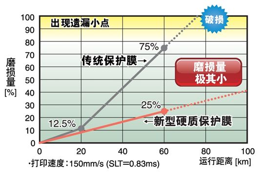 為了應(yīng)對(duì)這種情況,采取了將打印頭的保護(hù)膜材料變更為硬質(zhì)材料等對(duì)策,但提高保護(hù)膜的強(qiáng)度的課題是保護(hù)膜的組成和發(fā)熱部分的形狀設(shè)計(jì)。在以往的產(chǎn)品中,使用某些劣質(zhì)熱敏紙時(shí),使用壽命僅10km左右,這當(dāng)然與打印機(jī)的使用頻率也有關(guān)系,但發(fā)生過幾個(gè)月左右就無法使用的案例。羅姆面對(duì)這種情況,一直致力于改善保護(hù)膜材料中的硬質(zhì)材料的結(jié)構(gòu)和打印頭結(jié)構(gòu)。這次開發(fā)的熱敏打印頭通過優(yōu)化保護(hù)膜材料的構(gòu)成物質(zhì)及其組成,大幅提高了耐磨性,實(shí)現(xiàn)了比以往產(chǎn)品高約3倍的耐久性(保證150km(以往產(chǎn)品是50km))。另外,通過提高保護(hù)膜的熱導(dǎo)率,打印效率也比以往改善了15%,同時(shí)還提高了打印質(zhì)量。而且,這種打印頭的形狀保持與以往產(chǎn)品完全相同,因此無需進(jìn)行打印機(jī)的設(shè)計(jì)變更,另外,這種規(guī)格還可以用于修補(bǔ)替換。