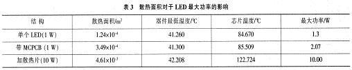 表3為3種不同散熱方式對(duì)LED的溫度分布、最大功率的影響??梢钥闯觯黾由崦娣e是很好的散熱方式,可以輕易地提高LED器件散熱能力,這是目前LED產(chǎn)品所普遍使用的散熱方式之一。然而缺點(diǎn)也很明顯:影響成本、增加產(chǎn)品重量、影響封裝密度。無(wú)限度地提高LED散熱片面積顯然不現(xiàn)實(shí),因此一般使用1.5inch2散熱片提升LED產(chǎn)品最大功率至10W左右,出于成本等因素就不能繼續(xù)提高。