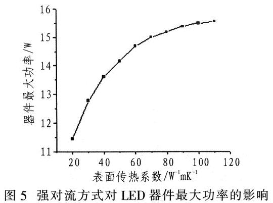 常見(jiàn)對(duì)流散熱方式有兩種:自然對(duì)流和強(qiáng)制對(duì)流。固定結(jié)構(gòu)的散熱與表面?zhèn)鳠嵯禂?shù)有關(guān)??绽浞绞綍r(shí),不同傳熱系數(shù)對(duì)最大功率的影響如圖5所示。強(qiáng)對(duì)流方式在一定速度內(nèi)會(huì)大大提高LED產(chǎn)品的散熱能力,有助于提高散熱效果。