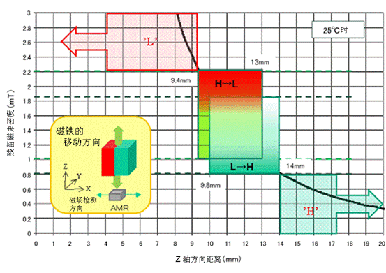 在電氣設(shè)計(jì)上,需要考慮傳感器的特性,使用的磁鐵特性,以及和傳感器的位置關(guān)系。圖7是模擬將鐵氧體磁鐵(5×4×6mm)沿Z軸(遠(yuǎn)離傳感器)方向移動(dòng)時(shí)的情況。從傳感器的磁滯開始,9.4mm以下輸出信號(hào)一定是“低”(靠近磁鐵,蓋閉合);14mm以上輸出信號(hào)一定為“高”(遠(yuǎn)離磁鐵,蓋打開)。實(shí)際設(shè)計(jì)的時(shí)候,還需要考慮到傳感器特性的偏差、溫度特性,磁鐵的溫度特性,生產(chǎn)時(shí)以及時(shí)間長了之后傳感器的位置偏移。