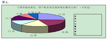 據(jù)中國機床工具工業(yè)協(xié)會統(tǒng)計,2010年我國機床工具產(chǎn)品進口總額為157.2億美元,同比增長62.0%,國內(nèi)機床進口額與歷史最高的2008年同期相比還增長了27.8%,創(chuàng)歷史新高。進口的增長迅猛表明國內(nèi)機床與國外機床的差距依然很大。本次調(diào)查報告顯示,中外機床的差距主要體現(xiàn)在三個方面:加工精度(25.2%)、可靠性(18.8%)、機床內(nèi)部電、氣、控等配置(16.5%)。緊跟其后的是加工速度和外形方面的色彩、精美程度等,均占13.1%(詳見圖5)。由此可見,技術(shù)尤其是對精準(zhǔn)度和可靠度是國外機床領(lǐng)先國內(nèi)機床的優(yōu)勢來源。另外,對外形的關(guān)注也是近年來客戶在使用方面出現(xiàn)的一種新口味。