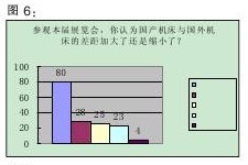 在本次調(diào)查報告中50%的受訪者認(rèn)為國產(chǎn)機床與國外機床的差距縮小了一些,認(rèn)為差距縮小了不少的受訪者也占到了17.5%(詳見圖6)。國內(nèi)機床行業(yè)取得的巨大進步有目共睹,本次展會展出的十二類專項產(chǎn)品正是對國內(nèi)機床行業(yè)成果的一次重大展示。
