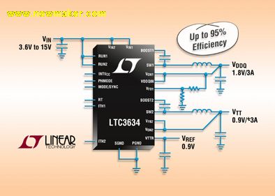凌力爾特公司 (Linear Technology Corporation) 推出高效率、雙通道單片同步降壓型穩(wěn)壓器LTC3634,該器件為DDR1、DDR2和DDR3 SDRAM控制器提供電源和總線終端軌。LTC3634 在3.6V至15V的輸入電壓范圍內(nèi)工作,從而非常適用于雙節(jié)鋰離子電池應(yīng)用以及5V和12V中間總線系統(tǒng)。LTC3634采用獨(dú)特的恒定頻率/受控接通時(shí)間、電流模式架構(gòu),這種架構(gòu)非常適用于從一個(gè)12V輸入電源以高開關(guān)頻率給DDR應(yīng)用供電。其終端電壓VTT設(shè)定為VDDQ的1/2,可低至0.6V,準(zhǔn)確度為±1.6%。單片設(shè)計(jì)和高達(dá)4MHz的開關(guān)頻率相結(jié)合,允許使用纖巧、低成本電容器和電感器,可為DDR電源應(yīng)用提供一種非常緊湊和高效率的解決方案。