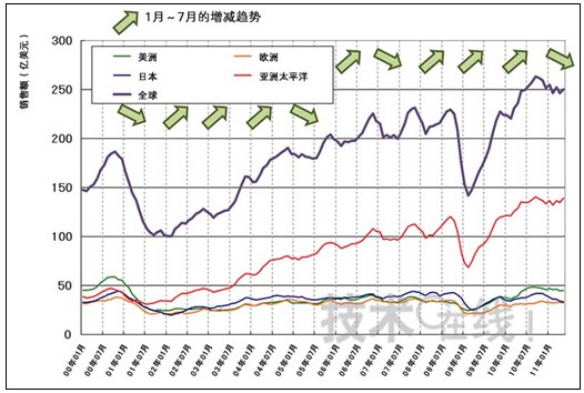 2011年1月份,全球半導(dǎo)體銷售額比上年同月增長(zhǎng)14%,實(shí)現(xiàn)了開門紅。此后,銷售額與上月相比時(shí)增時(shí)減,而從稍長(zhǎng)一點(diǎn)的時(shí)間區(qū)間來看,銷售額自2010年10月達(dá)到頂峰以后一直在減少。從2001年以后每年上半年的增減趨勢(shì)來看,增長(zhǎng)的年份居多。這意味著2011年出現(xiàn)了停滯和衰退。