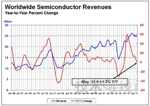 美國(guó)半導(dǎo)體工業(yè)協(xié)會(huì)發(fā)布的資料顯示,2011年5月份的全球半導(dǎo)體銷售額為250億300萬美元(3個(gè)月的移動(dòng)平均值。下同)。比上年同月僅增長(zhǎng)1.3%,與上個(gè)月相比,也只增長(zhǎng)1.8%。