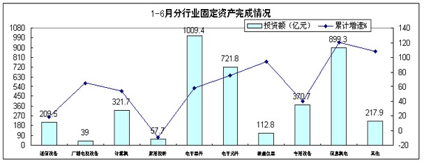 上半年,電子信息產(chǎn)業(yè)500萬元以上項目完成投資3960億元,規(guī)模接近去年前三季度水平,同比增長67.6%,高于去年同期26.6個百分點,高于同期工業(yè)投資40.7個百分點。自二季度起,投資增速高位回落,6月份增速(37.5%)比4、5月份分別回落52和31.4個百分點。